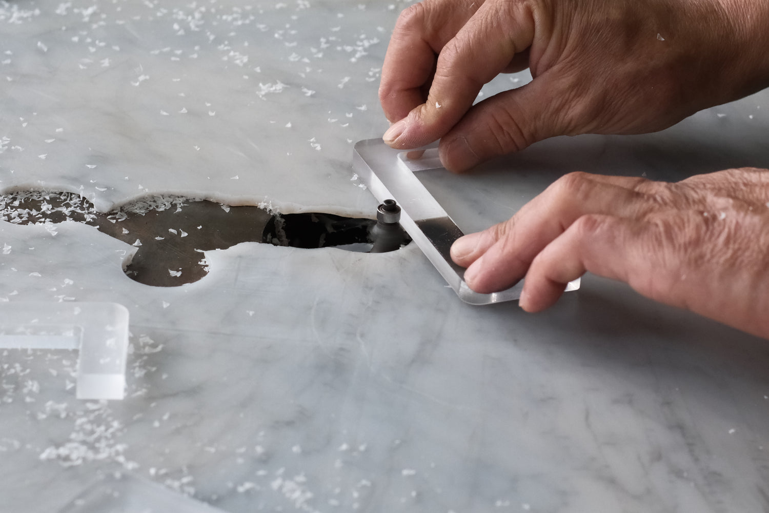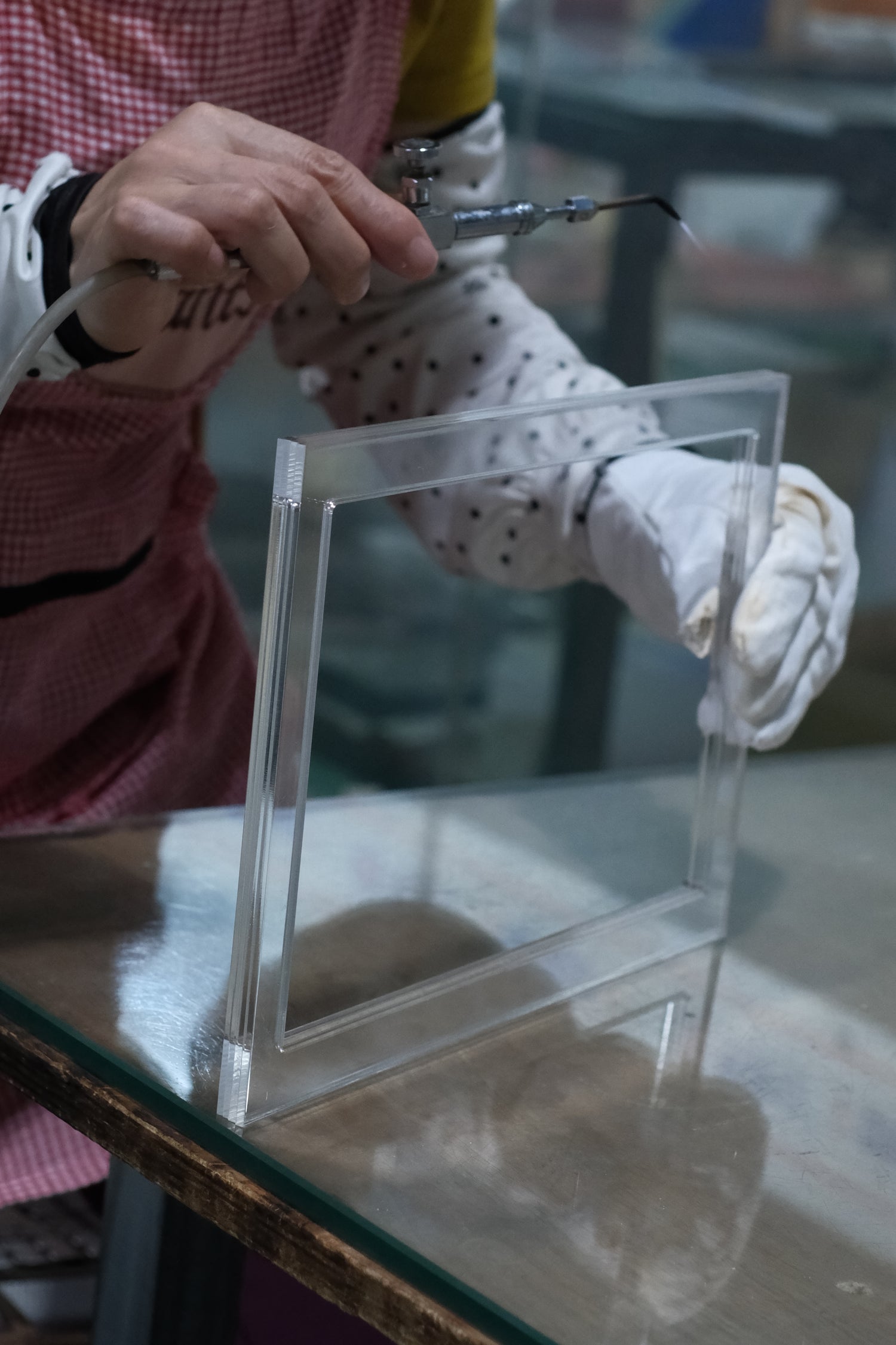 A craftsman with 30 years of experience carefully drills holes into the acrylic sheets and embeds magnets with precise force. This ensures accurate placement and secure attachment, enhancing both functionality and aesthetics.